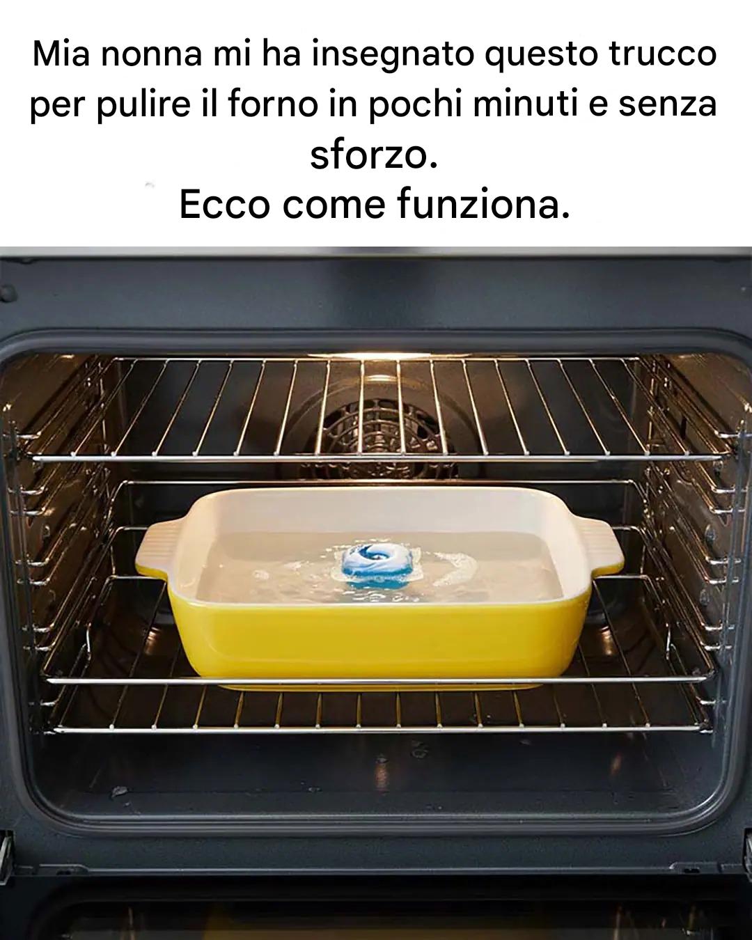 C'est un secret de la nonna qui est nasconde dans... une capsule pour le lavage ! Oui, celui-ci est inséré dans le compartiment des chaises. Pourquoi fonctionne-t-il ? Parce que cette petite capsule contient des agents gras très puissants, il est prévu d'éliminer également les résidus les plus ostinés. En combinaison avec la vapeur, l'intérieur du forno s'améliore délicatement. Incroyable, Véro ?